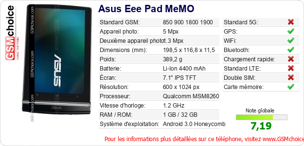 Publier les caractéristiques de ce mobile Asus Eee Pad MeMO sur votre site