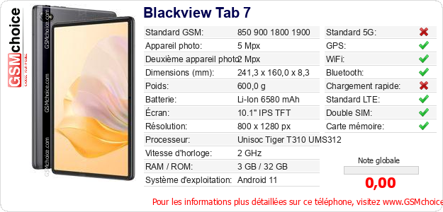 Publier les caractéristiques de ce mobile Blackview Tab 7 sur votre site