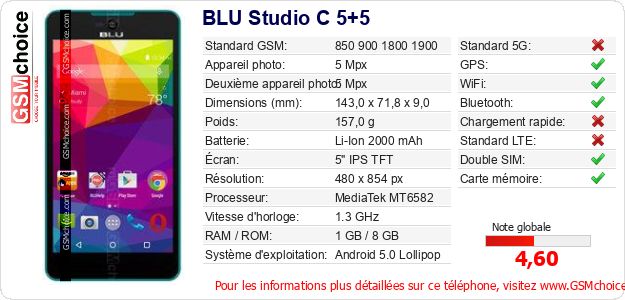 Publier les caractéristiques de ce mobile BLU Studio C 5+5 sur votre site