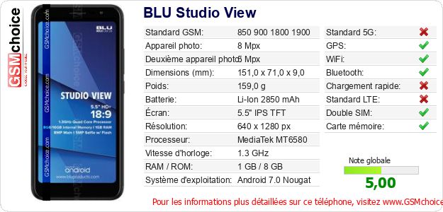 Publier les caractéristiques de ce mobile BLU Studio View sur votre site