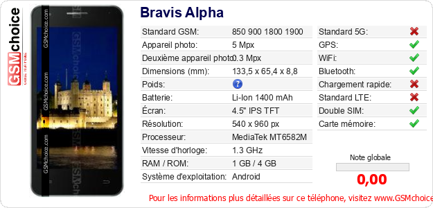Publier les caractéristiques de ce mobile Bravis Alpha sur votre site