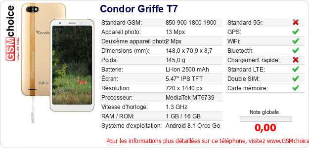 Publier les caractéristiques de ce mobile Condor Griffe T7 sur votre site