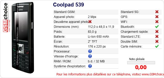 Publier les caractéristiques de ce mobile Coolpad 539 sur votre site
