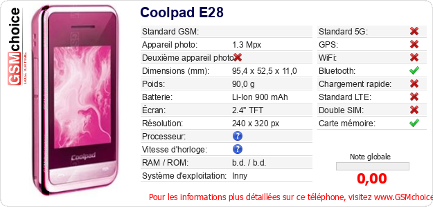 Publier les caractéristiques de ce mobile Coolpad E28 sur votre site