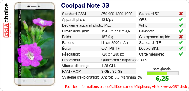 Publier les caractéristiques de ce mobile Coolpad Note 3S sur votre site