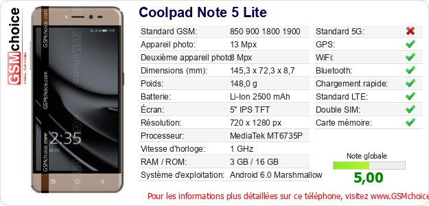 Publier les caractéristiques de ce mobile Coolpad Note 5 Lite sur votre site