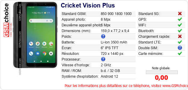 Publier les caractéristiques de ce mobile Cricket Vision Plus sur votre site