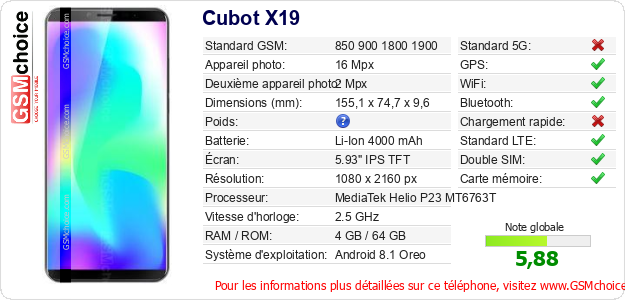 Publier les caractéristiques de ce mobile Cubot X19 sur votre site