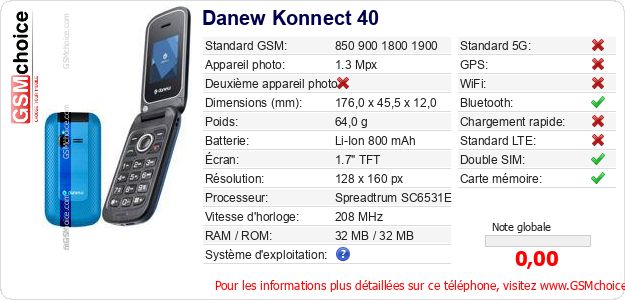 Publier les caractéristiques de ce mobile Danew Konnect 40 sur votre site