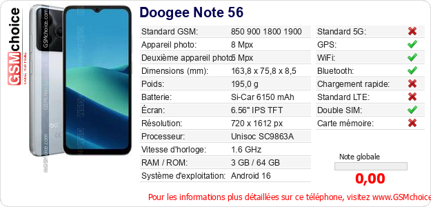 Publier les caractéristiques de ce mobile Doogee Note 56 sur votre site