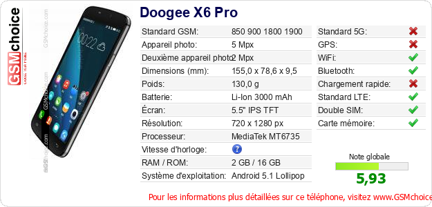 Publier les caractéristiques de ce mobile Doogee X6 Pro sur votre site