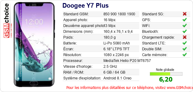 Publier les caractéristiques de ce mobile Doogee Y7 Plus sur votre site
