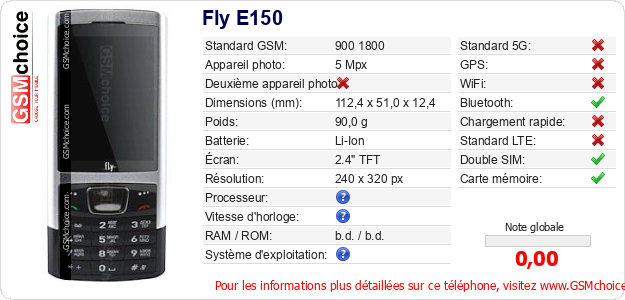 Publier les caractéristiques de ce mobile Fly E150 sur votre site