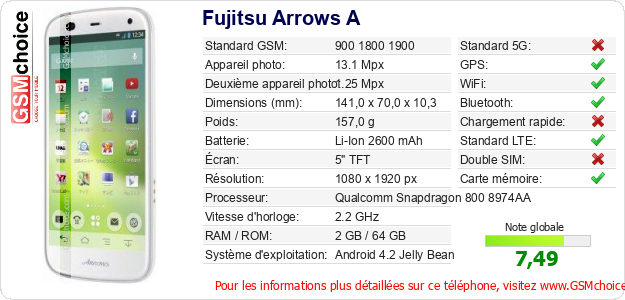 Publier les caractéristiques de ce mobile Fujitsu Arrows A sur votre site