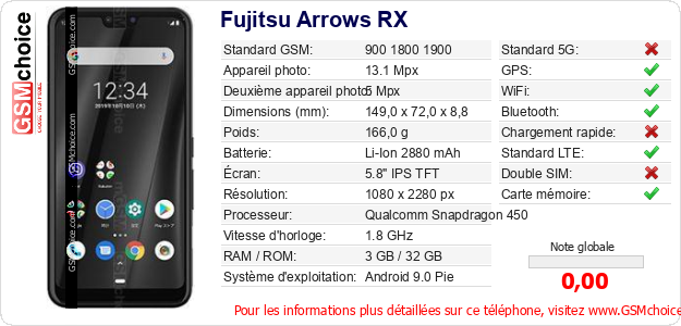 Publier les caractéristiques de ce mobile Fujitsu Arrows RX sur votre site