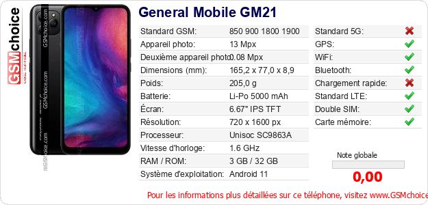 Publier les caractéristiques de ce mobile General Mobile GM21 sur votre site
