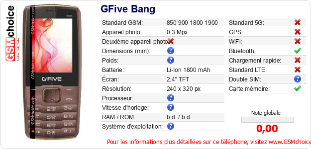 Publier les caractéristiques de ce mobile GFive Bang sur votre site