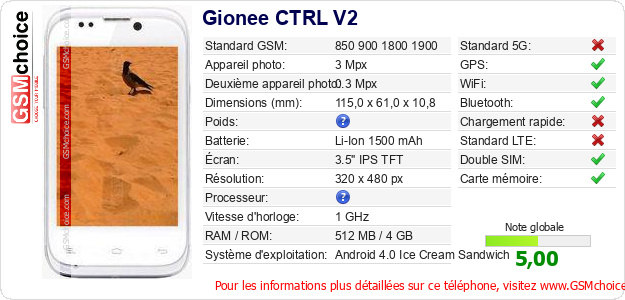 Publier les caractéristiques de ce mobile Gionee CTRL V2 sur votre site