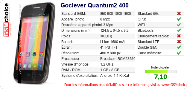 Publier les caractéristiques de ce mobile Goclever Quantum2 400 sur votre site