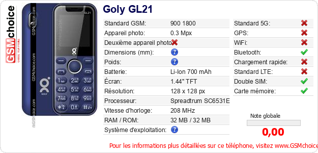 Publier les caractéristiques de ce mobile Goly GL21 sur votre site