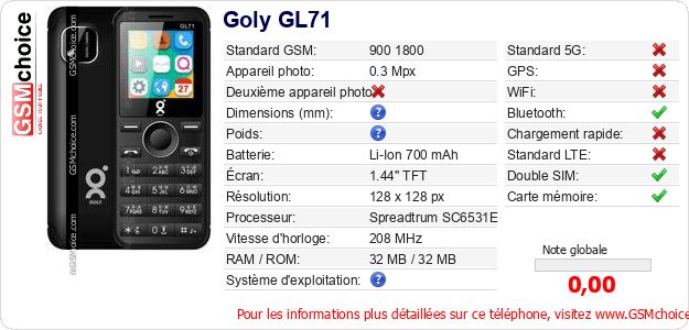 Publier les caractéristiques de ce mobile Goly GL71 sur votre site
