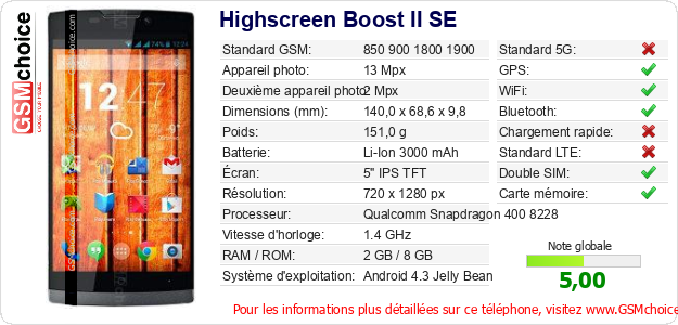 Publier les caractéristiques de ce mobile Highscreen Boost II SE sur votre site