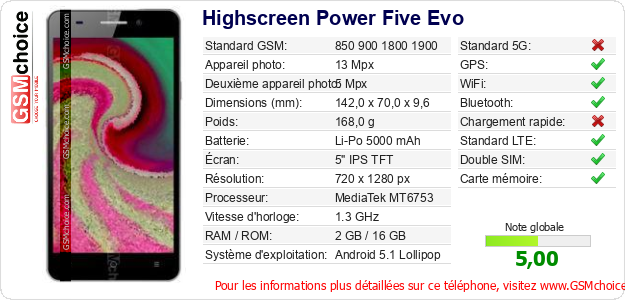 Publier les caractéristiques de ce mobile Highscreen Power Five Evo sur votre site