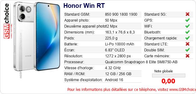 Publier les caractéristiques de ce mobile Honor Win RT sur votre site