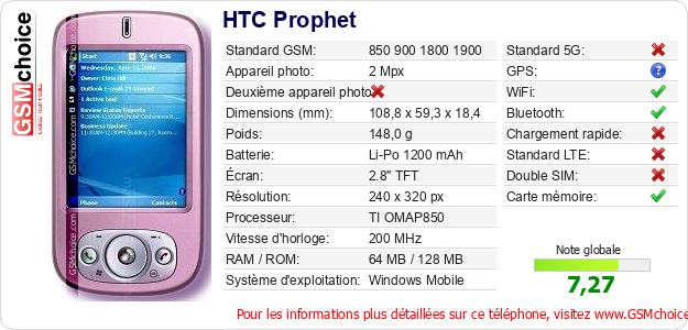 Publier les caractéristiques de ce mobile HTC Prophet sur votre site
