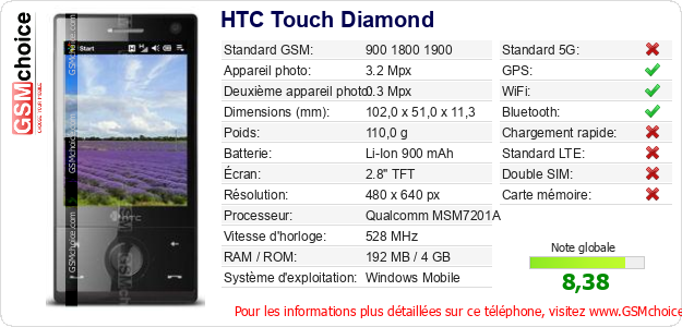 Publier les caractéristiques de ce mobile HTC Touch Diamond sur votre site