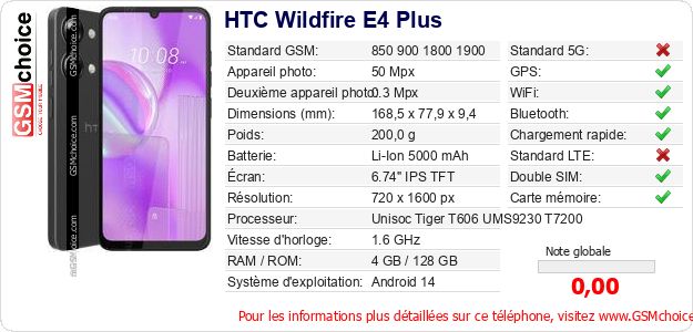 Publier les caractéristiques de ce mobile HTC Wildfire E4 Plus sur votre site