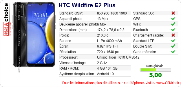 Publier les caractéristiques de ce mobile HTC Wildfire E2 Plus sur votre site