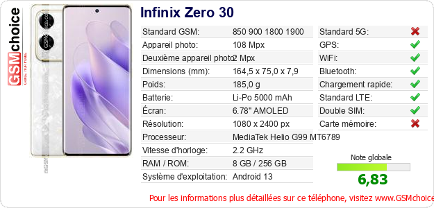 Publier les caractéristiques de ce mobile Infinix Zero 30 sur votre site