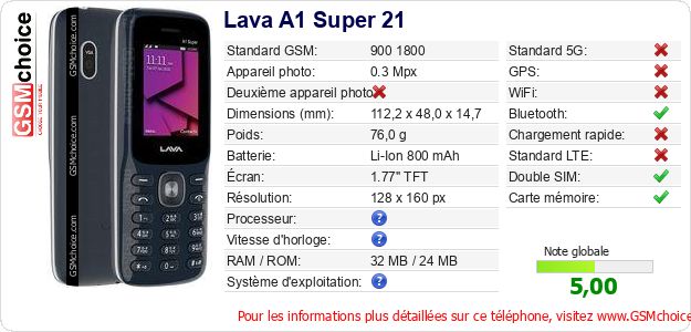 Publier les caractéristiques de ce mobile Lava A1 Super 21 sur votre site