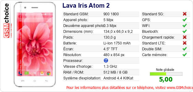 Publier les caractéristiques de ce mobile Lava Iris Atom 2 sur votre site
