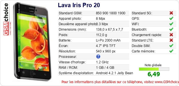 Publier les caractéristiques de ce mobile Lava Iris Pro 20 sur votre site
