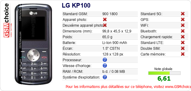 Publier les caractéristiques de ce mobile LG KP100 sur votre site