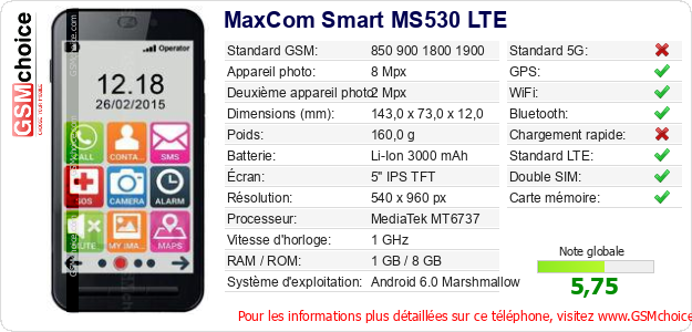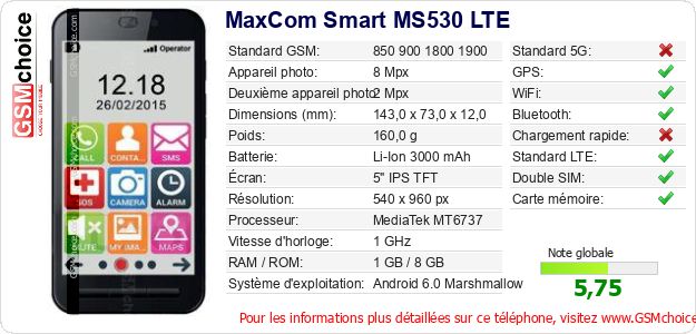 Publier les caractéristiques de ce mobile MaxCom Smart MS530 LTE sur votre site