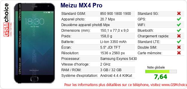 Publier les caractéristiques de ce mobile Meizu MX4 Pro sur votre site