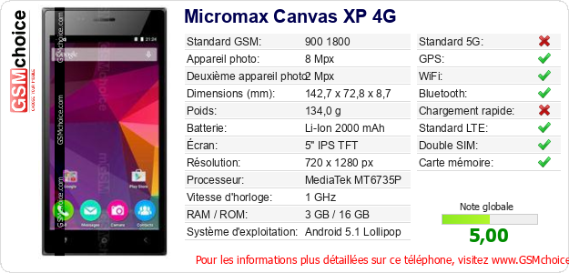 Publier les caractéristiques de ce mobile Micromax Canvas XP 4G sur votre site