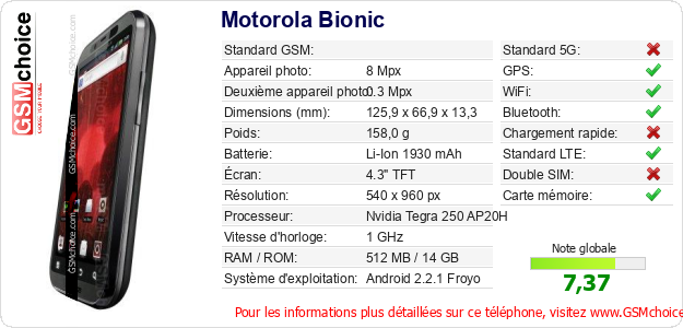 Publier les caractéristiques de ce mobile Motorola Bionic sur votre site