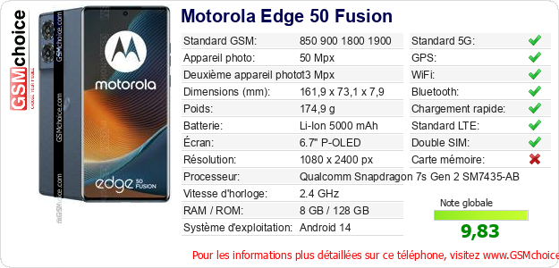 Publier les caractéristiques de ce mobile Motorola Edge 50 Fusion sur votre site