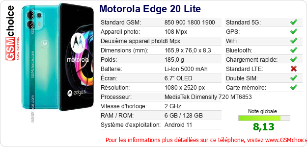 Publier les caractéristiques de ce mobile Motorola Edge 20 Lite sur votre site