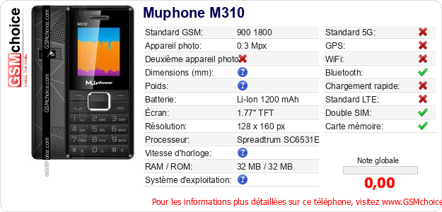 Publier les caractéristiques de ce mobile Muphone M310 sur votre site