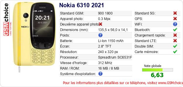 Publier les caractéristiques de ce mobile Nokia 6310 2021 sur votre site