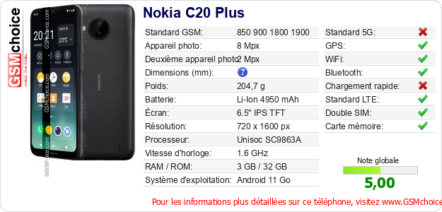 Publier les caractéristiques de ce mobile Nokia C20 Plus sur votre site
