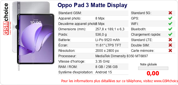 Publier les caractéristiques de ce mobile Oppo Pad 3 Matte Display sur votre site
