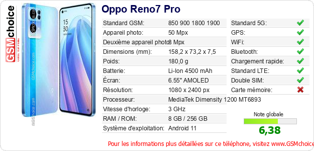 Publier les caractéristiques de ce mobile Oppo Reno7 Pro sur votre site