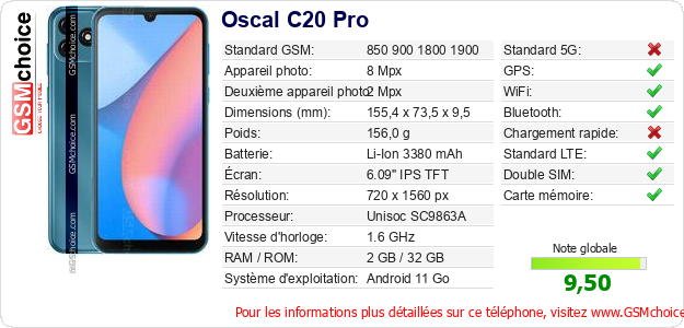 Publier les caractéristiques de ce mobile Oscal C20 Pro sur votre site