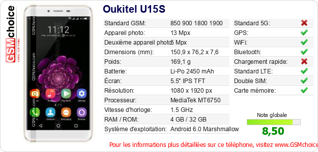 Publier les caractéristiques de ce mobile Oukitel U15S sur votre site